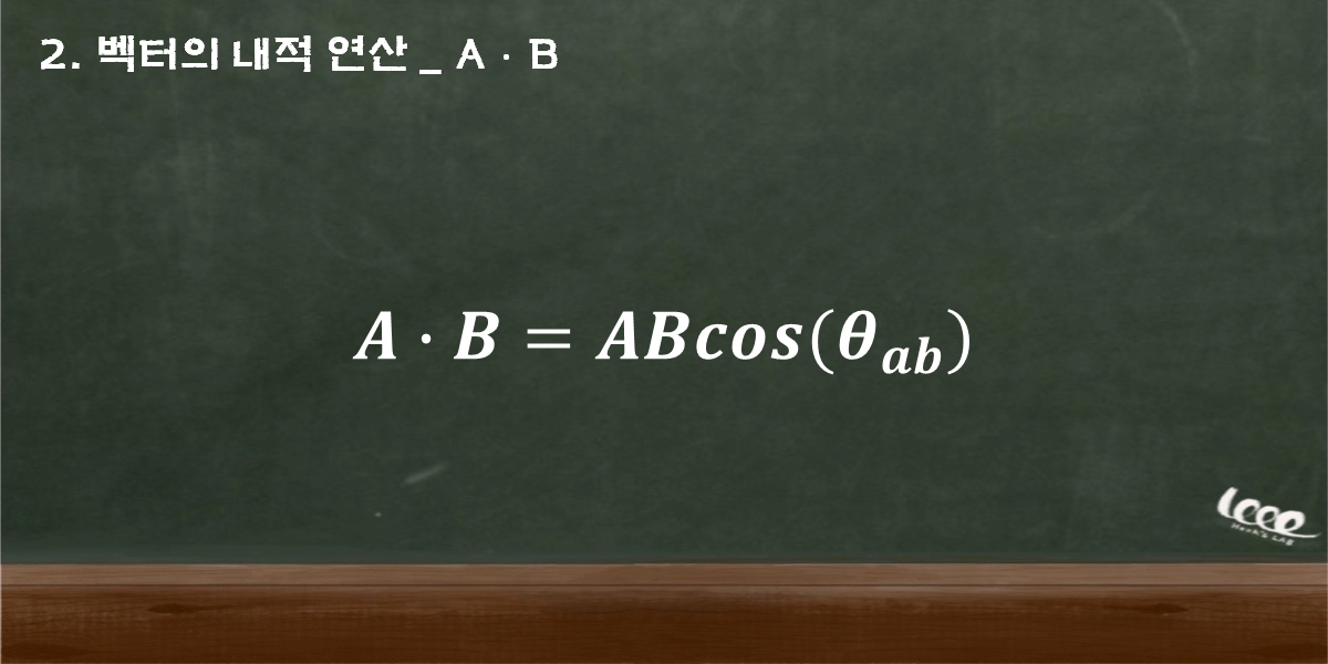 스칼라 곱이라고도 불리는 이유는 계산 결과가 스칼라가 되기 때문인데, 두 벡터의 내적은 스칼라 형태이다.