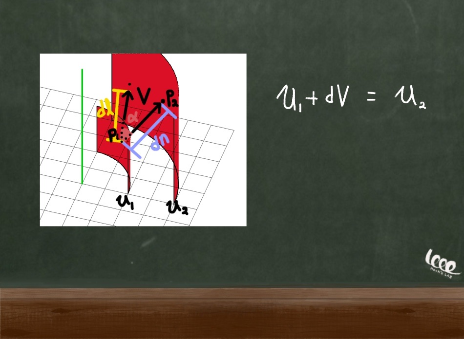 그렇다면 dV는 무엇을 의미하는가? 여기에서 dV는 u1에서의 미소 변화량을 뜻한다. 일반적으로 dV는 스칼라 함수의 상수 표면 위에 어떤 점을 잡았느냐에 따라서 달라진다.