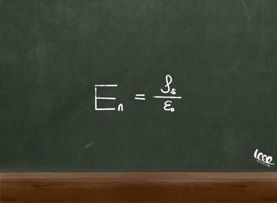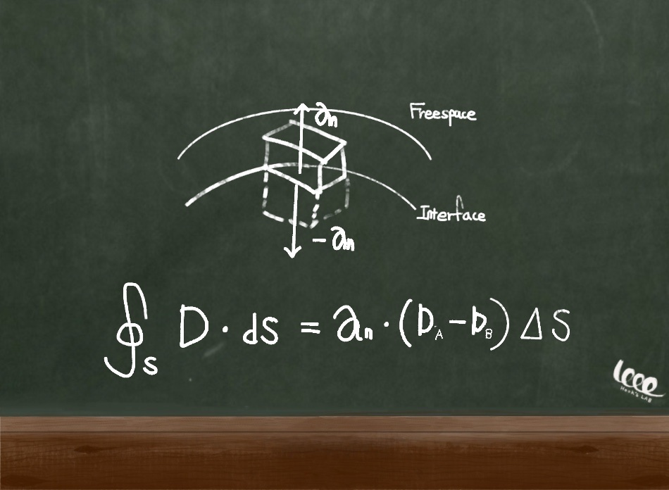 수평 성분의 경우 물질 A와 B의 폐곡선의 적분이 서로 동일하다. 그리고 수직 성분의 경우 물질 A와 B의 표면 적분 값은 서로 다르다. 이때 법선 벡터의 방향이 반대이므로, 대체 전기장의 크기는 물질 A에 의한 전기장 - B에 비례하게 된다.