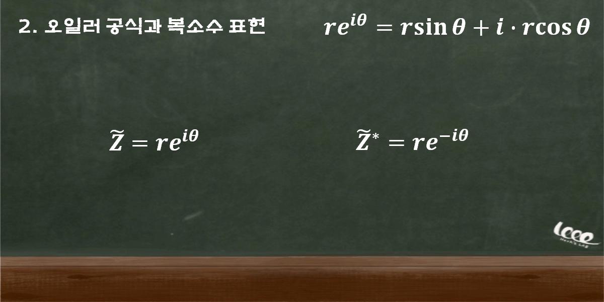 오일러 공식에 따라서 자연로그 e에 관한 함수는 다음과 같이 코사인과 사인 함수의 복소수 형태로 표현 가능하다. x축은 실수(Real) 영역이고, y축은 허수(Imaginary) 영역이 된다.