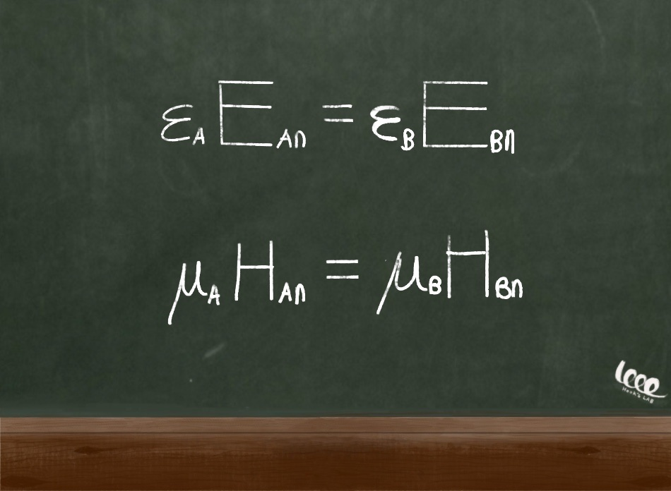 서로 다른 두 물질이 이루는 경계면에서 맥스웰 방정식의 세 번째와 네 번째 식을 적용하면, 다음과 같은 법선 방향의 전기장과 자기장 관계식을 유도 할 수 있다.