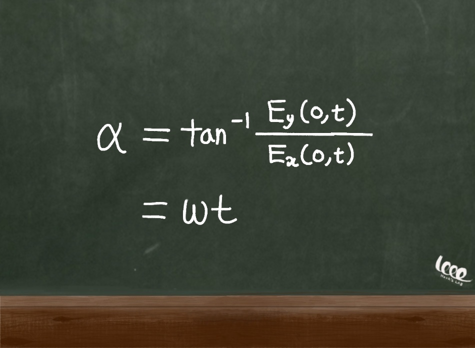이렇게 전기장 벡터는 페이저 벡터로 가정하였으므로, 해당 위치를 가리키는 각도(alpha)를 알 수 있고 그 각도는 다음과 같이 전기장 벡터의 각속도를 통해서 알아낼 수 있다.