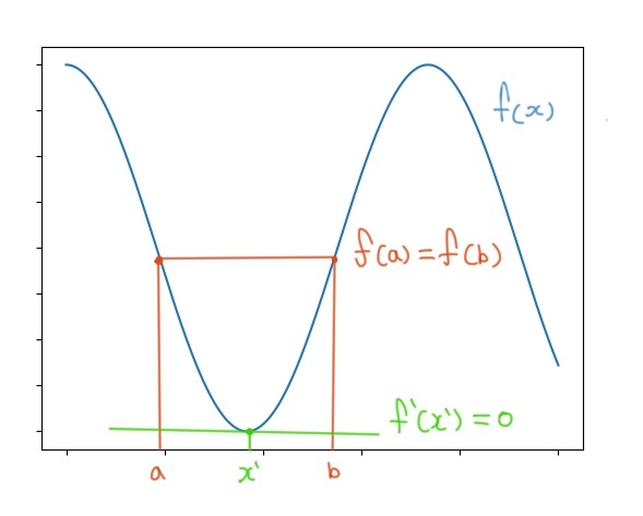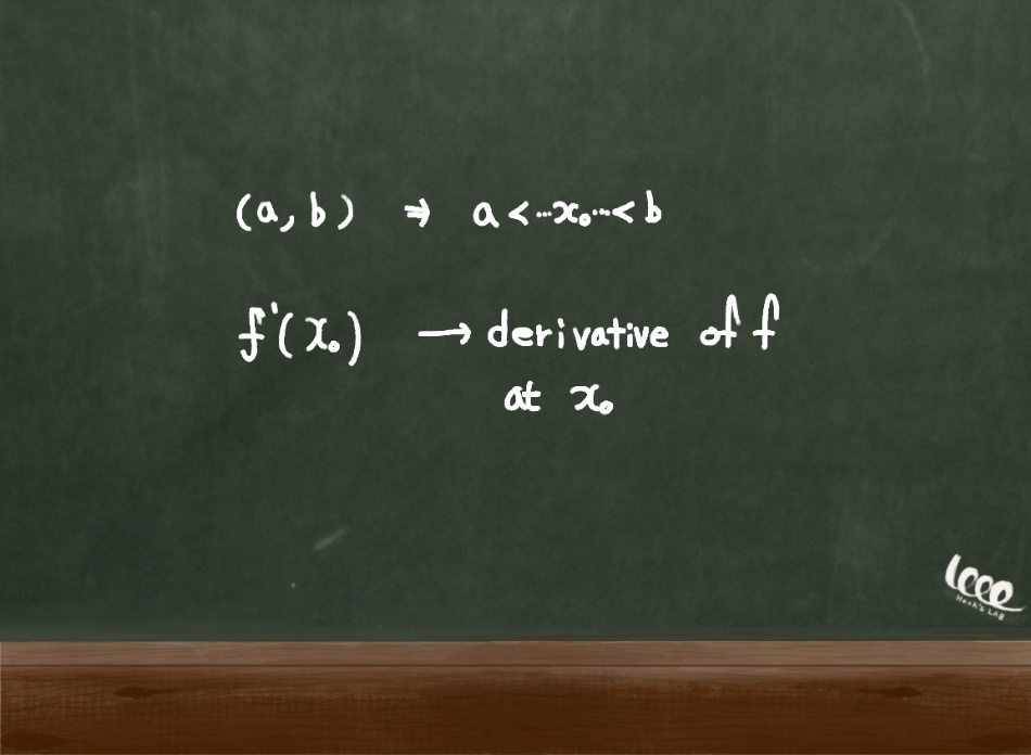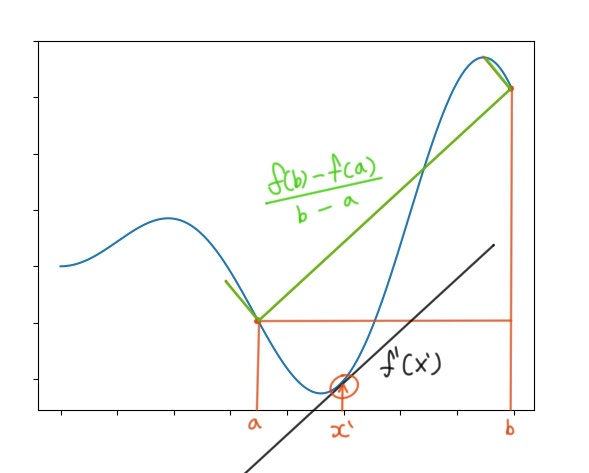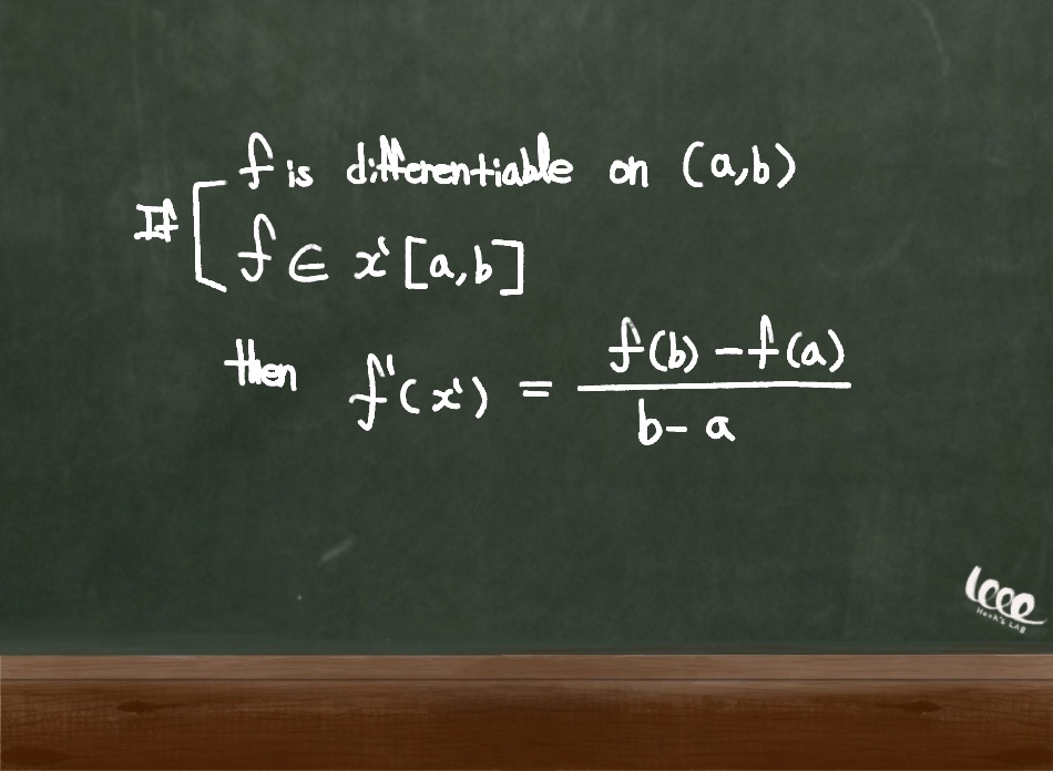 가정 조건 : 미분 가능한 함수 f(x)가 존재하고, 임의의 개구간[a, b]에 어떤 변수 x'가 존재한다.