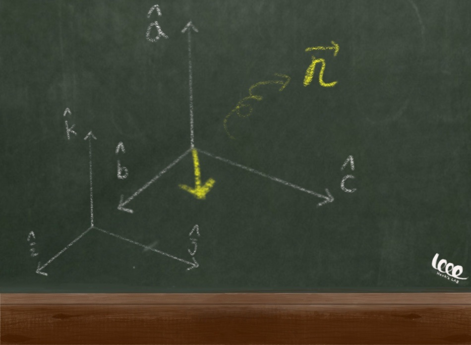 * 에타 벡터가 있는 좌표계 1은 단위 벡터가 각각 a, b, c로 기술되어있고, 바깥의 좌표계 2는 i, j, k 단위 벡터로 축이 이루어져 있다.