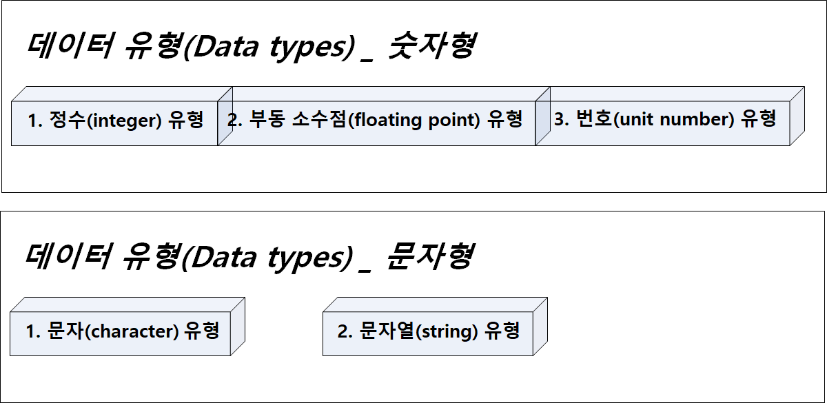 파이썬에서 사용하는 데이터 유형은 크게 숫자형 3개와 문자형 2개가 존재한다. 물론 그 외에도 더 있지만, 자주 사용하는 5개를 알아보도록 하자. 숫자형에는 정수(integer), 부동 소수점(floating point), 번호(unit number) 형태의 데이터 유형이 있다. 그리고 문자형에는 문자(character), 문자열(string) 형태의 데이터 유형이 존재한다. 다음의 개요도를 참고하자.