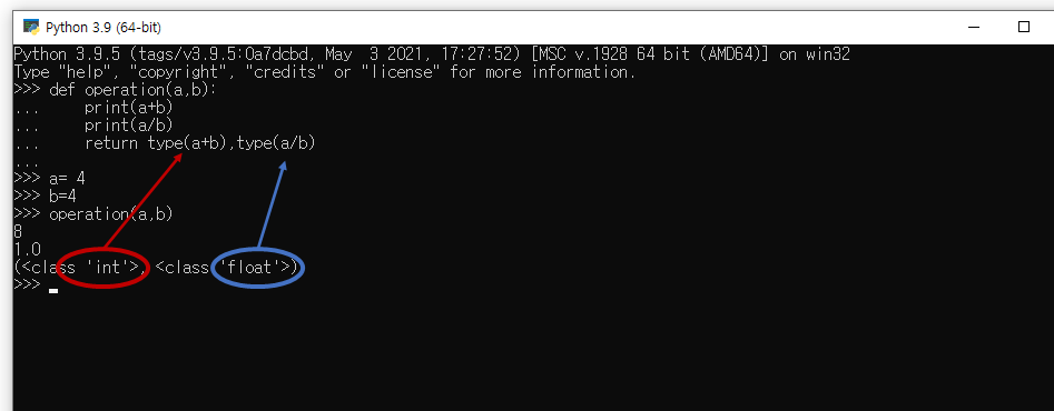 return type(a+b),type(a/b)