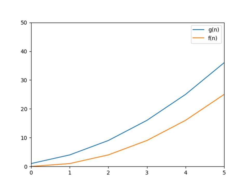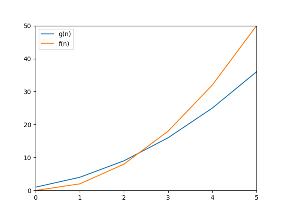즉, 빅-오의 괄호 안에 들어가는 함수 f(n) 은 어떤 함수 g(n)의 최소 성장률(smallest rate of growth)을 암시한다. 그리고 이 함수 f(n)이 바로 g(n)에 대해서 점근적으로 가까운 상한(Asymptotic tight upper bound)이 되는 것이다. 보다 명확한 이해를 위해 다음과 같이 각각의 함수 그래프를 그려보자. 왼쪽의 그림을 보면 f(n)이 최소 성장률이 되는 것을 한눈에 알 수 있다.