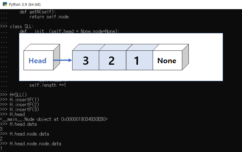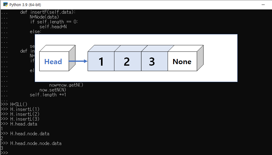 위 프로그램의 동작 개요를 보면 헤드가 어떤 역할을 하는지 알 수 있다. 다음은 SLL함수에 데이터를 삽입하고 삭제하는 기능을 추가하자.