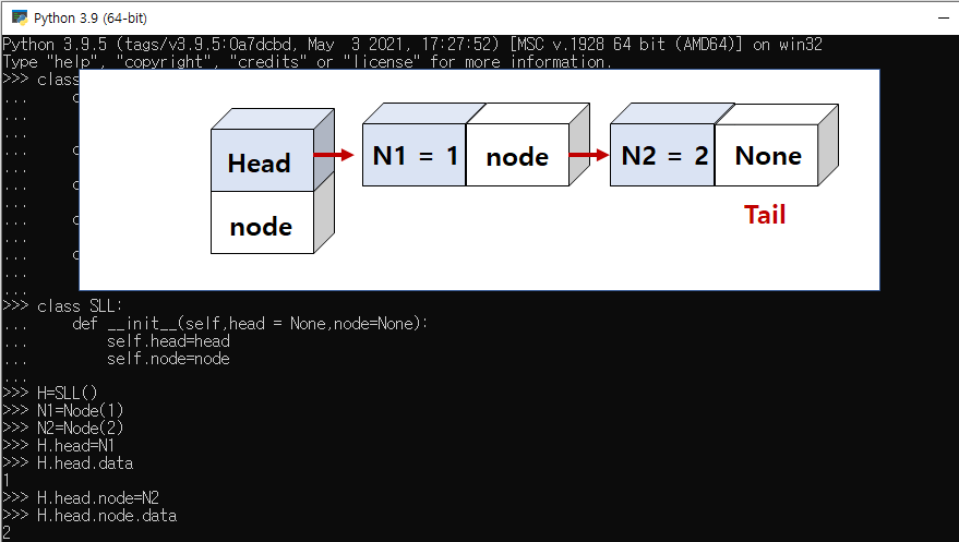 지금까지는 SSL 클래스를 선언하고, 헤드 변수를 따로 이해하지 않았다. 노드를 생성할 수 있다면, 그것은 특정 변수가 클래스를 지정하는 포인터가 된다는 것이고, 그것은 변수에 노드 블록의 주소를 할당해 주는 의미를 가지고 있다. 가시적으로는 다음의 그림과 같은 의미다.