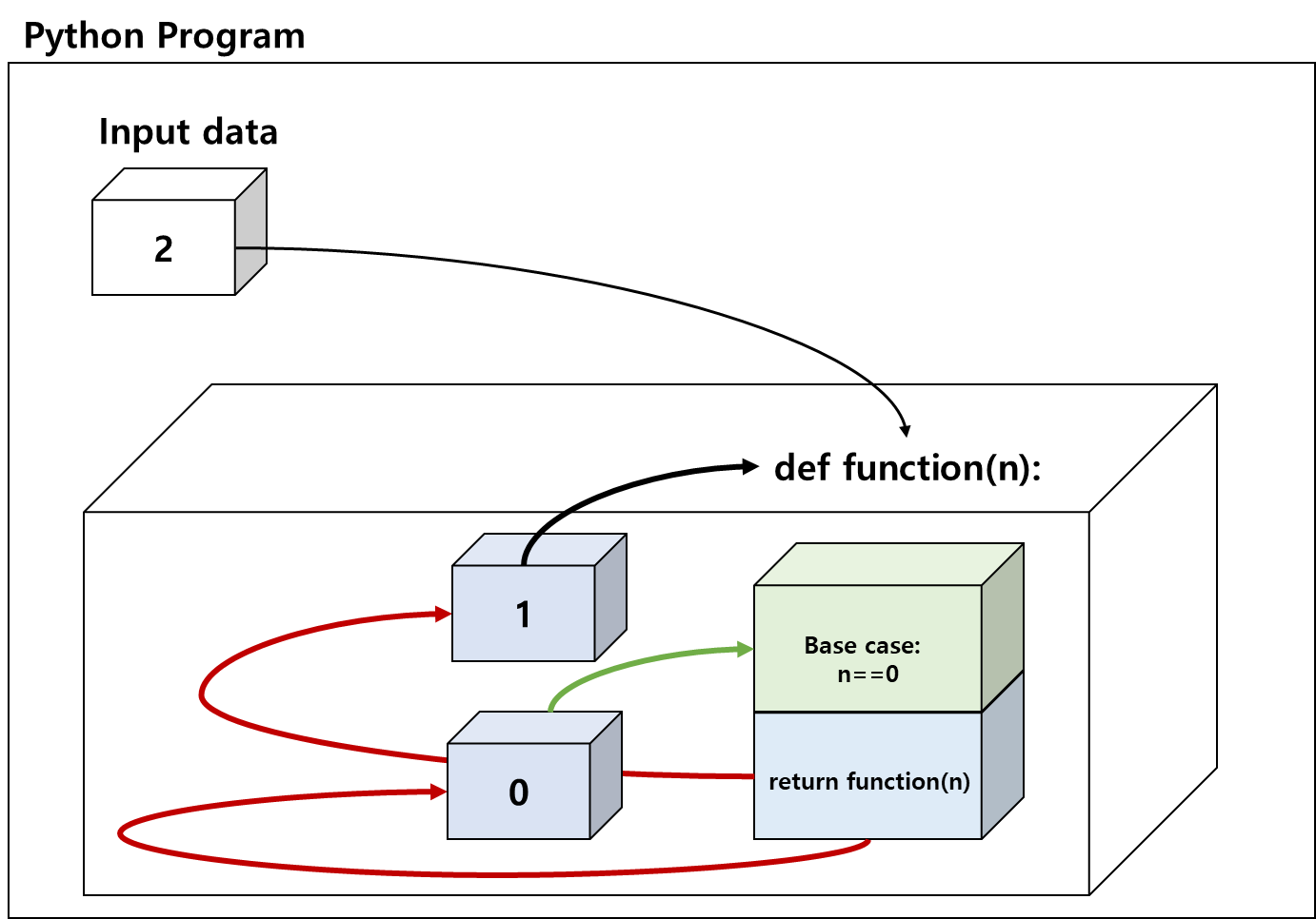 재귀 함수는 자기 자신을 참조하는 개념의 함수이다. 재귀 함수에 어떤 값을 넣는다면, 스택 오버플로우가 발생하지 않는 선에서 함수는 자기 자신을 계속해서 참조한다. 그리고 종료 조건에 도달한다면, 함수는 차례대로 값을 반환하기 시작한다. 다음의 그림을 참고하자.