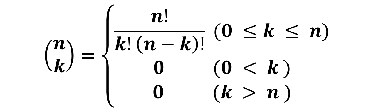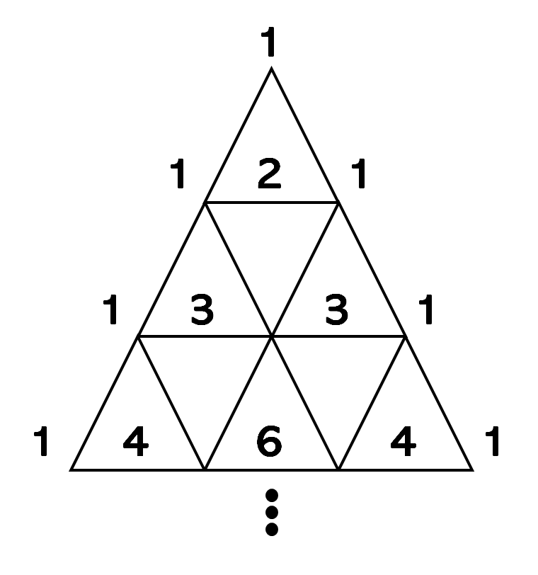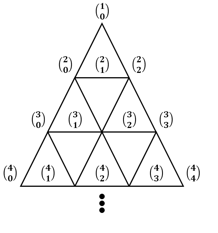 여기에서 n은 자연수, k는 정수를 의미한다. 조건에 따라 k와 n은 0보다 커야 한다. 얼핏 보기에 왜 이게 이항 계수가 되는지 이해하기 힘들 수 있는데, 다음의 그림을 참고하면, 이해하기 쉽다.