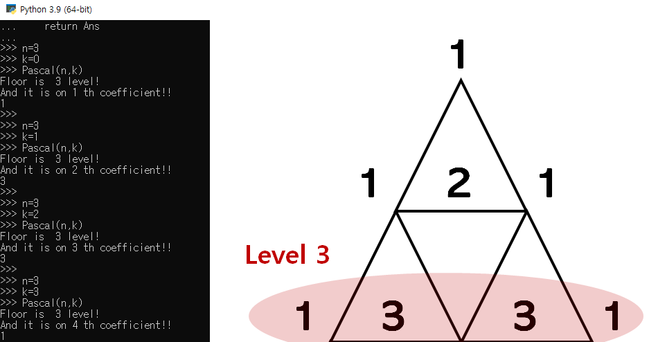 * 맞는지 확인해보기 위해 파스칼 삼각형의 3번째 층의 결과를 확인해보았다. 코드 결과는 다음과 같다.