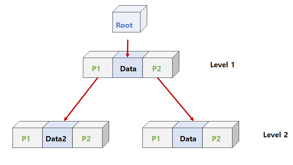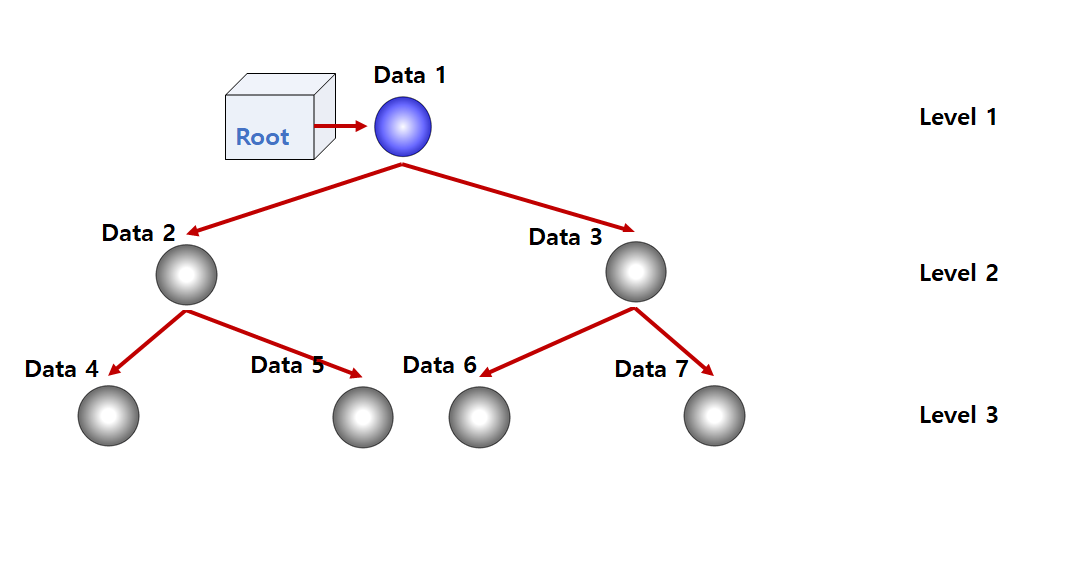 그림에서 처럼 데이터가 계속해서 뻗어나갈수록 데이터의 총량은 기하급수적으로 증가할 것이다. 따라서 트리에는 데이터와 관련된 다양한 용어들이 존재한다. 위에서 보인 레벨 1과 레벨 2가 그 예이다. 각각의 데이터에 해당하는 레벨 계층을 통해서 데이터의 위치를 짐작할 수 있다. 또 연결 리스트에서 보였던 헤드(head) 포인터는 룻트(root)라고 지칭한다. 즉, 모든 트리는 룻트라 불리는 가장 근본이 되는 데이터를 갖고 있다. 그리고 이 룻트가 지칭하는 데이터는 부모(paaents) 데이터가 존재하지 않는다.