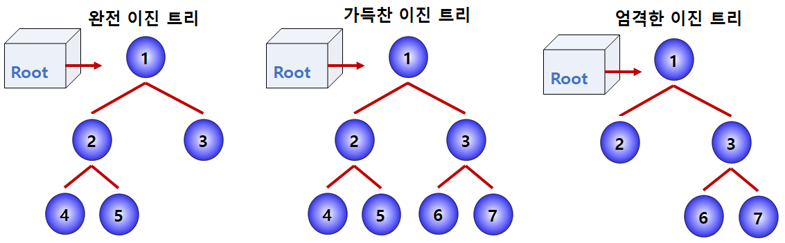 가득 찬 이진트리의 경우, 마지막 계층을 제외한 모든 노드가 정확히 2개의 노드로 구성된 트리를 말한다. 그리고 엄격한 이진트리의 경우는 각각의 노드들이 정확히 2개의 노드를 갖거나 없는 경우를 의미한다.