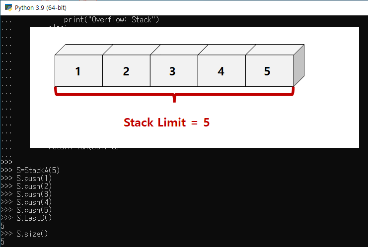 보조 ADT 중 배열의 끝에 있는 데이터를 반환하는 기능과 사이즈 확인 기능을 다음과 같이 추가하도록 하자.