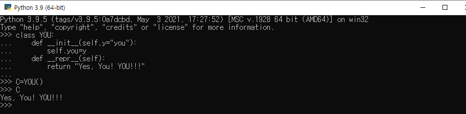 클래쓰 함수 내부에 존재하는 이 __repr__ 함수는 놀랍게도 어떤 클래스 변수의 반환을 문자열로 바꾸어준다. 따라서 우리가 어떤 클래스 함수의 메모리를 담고 있는 변수를 출력하도록 할 때 사용자가 임의로 설정한 문자열로 반환하도록 할 수 있는 것이다. 사용법은 다음의 예시 코드를 참고하자.