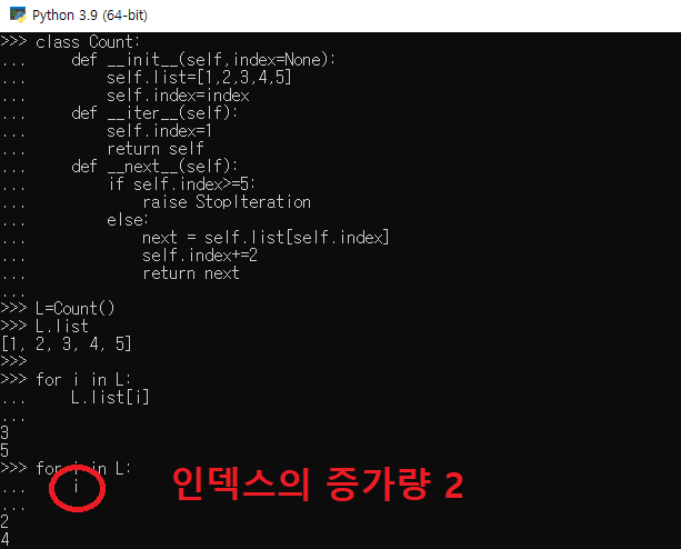 클래스 함수에서 이 순차적 명령을 내려주는 함수를 바꿔주는 역할을 바로 '__next__' 함수가 제공한다. 같은 맥락으로 '__iter__' 함수는 반환되는 인덱스 값을 변경한다. 반복 가능한 객체에 대해 이해가 되었다면, 다음의 예제 코드로 카운트 함수를 더 괴랄하게 만들어보자.