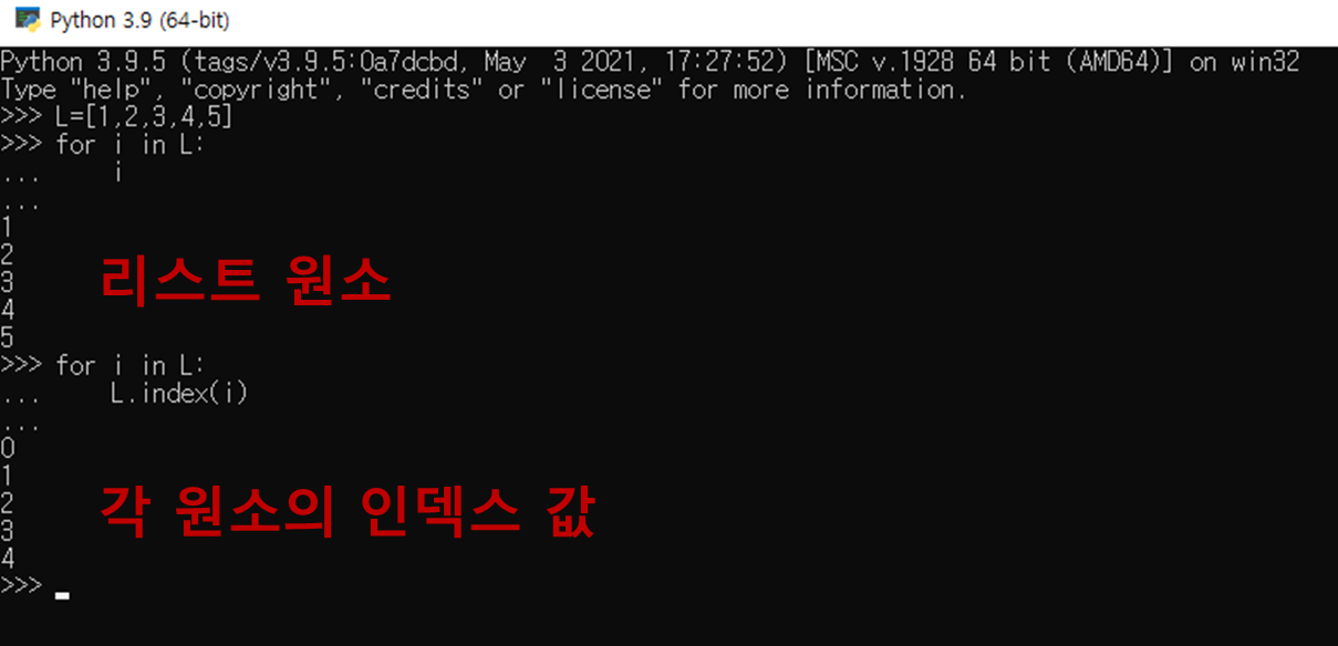 코드를 이해하기 위해서 데이터의 자료형의 특징을 짚고 넘어가자. 대표적으로 리스트, 튜플, 딕셔너리와 같은 데이터 타입을 떠올리면 이들은 데이터가 순차적으로 저장되어있다는 것을 어렴풋이 눈치챌 수 있다. 이렇게 자료 구조가 순차적으로 저장된 형태의 객체를 반복 가능한(iterable) 성질을 가졌다고 말한다. 그리고 이 반복 가능한 성질을 번호와 같은 순회 정보를 가지는 객체를 반복자(iterator)이라고 한다. 즉, iterable 한 객체들은 모두 iterator가 되기 위한 조건을 충족하고 있는 것이다. 예를 들어, 1,2,3,4,5의 데이터가 리스트 형태로 존재한다고 가정하자. 반복문을 사용하여 인덱스를 순차적으로 나타내면 다음과 같다.