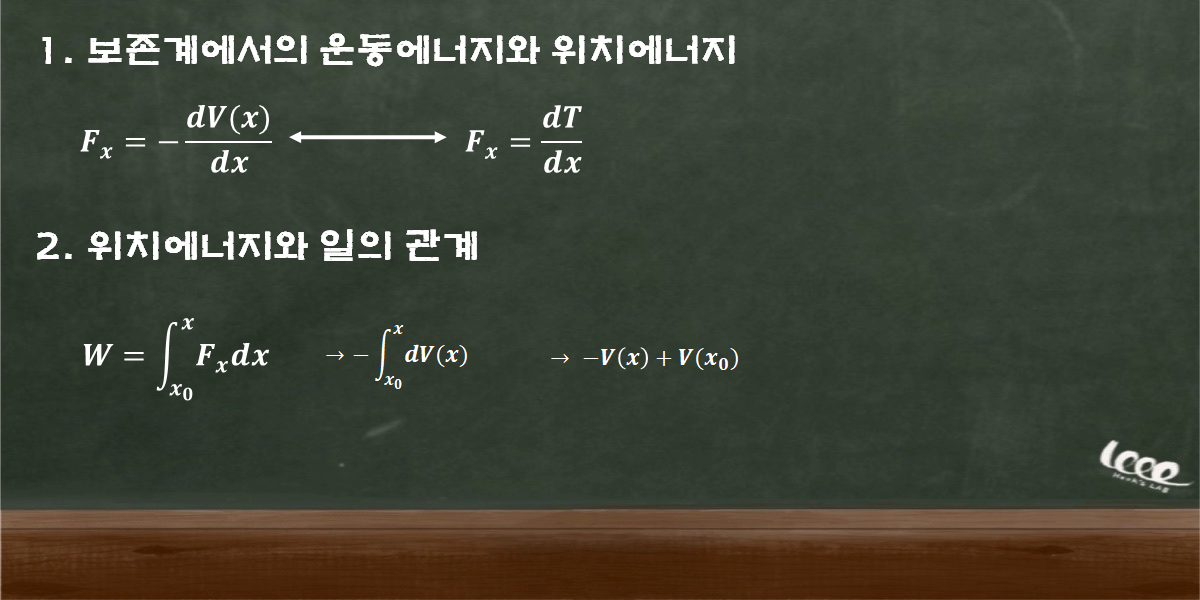 어떤 계에 일정한 힘이 작용하고, 그 힘이 보존력이라면 위치 에너지는 운동에너지의 감소량으로 기술하는 것이 가능하다. 이 사실을 이용하면 일의 양은 다음과 같은 운동에너지와 위치에너지의 관계식으로 기술할 수 있다.