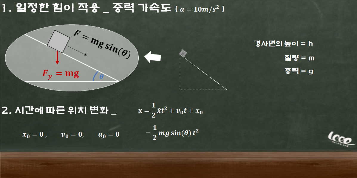 일정한 힘의 가장 좋은 예시는 바로 중력이다. 이 중력 가속도는 g 기호로 약 9.8m/s2를 사용하는 것으로 잘 알려져 있다. 우리는 산술상의 이점을 위해 10m/s2으로 중력가속도를 가정하고 다음과 같은 경사면에서 직사각형 물체가 어떻게 움직이는지 참고하도록 하자.
