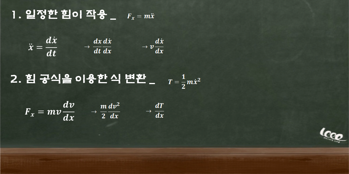 운동 에너지는 움직이는 물체의 가속도를 이용하여 일의 양을 계산한다. 다음의 과정을 직접 유도해봄으로써 운동 상태를 통해서 운동에너지를 구해보자.