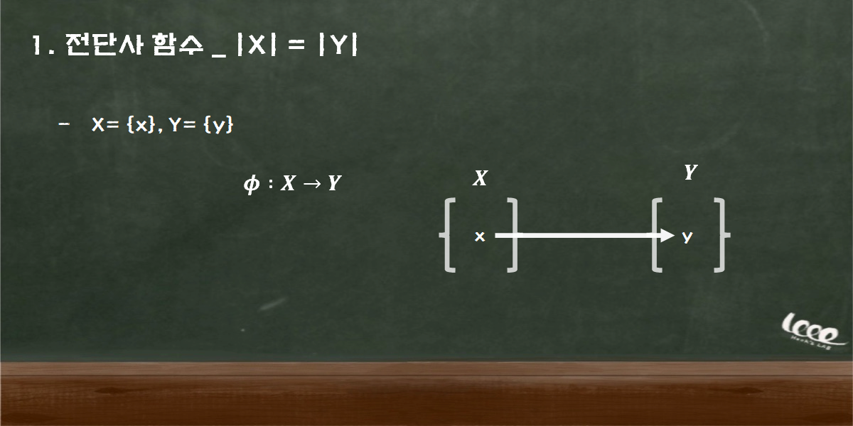 먼저 전단사 함수(bijective function)는 기본적으로 두 집합의 원소 개수가 동일하며, 그 관계를 중복이 없는 일대일 대응관계로 나타낼 수 있어야 한다. 원소 x를 가지는 집합 X, y를 가지는 집합 Y가 존재한다고 가정하자. 중복이 없는 일대일 대응 관계는 다음과 같이 나타낼 수 있다.