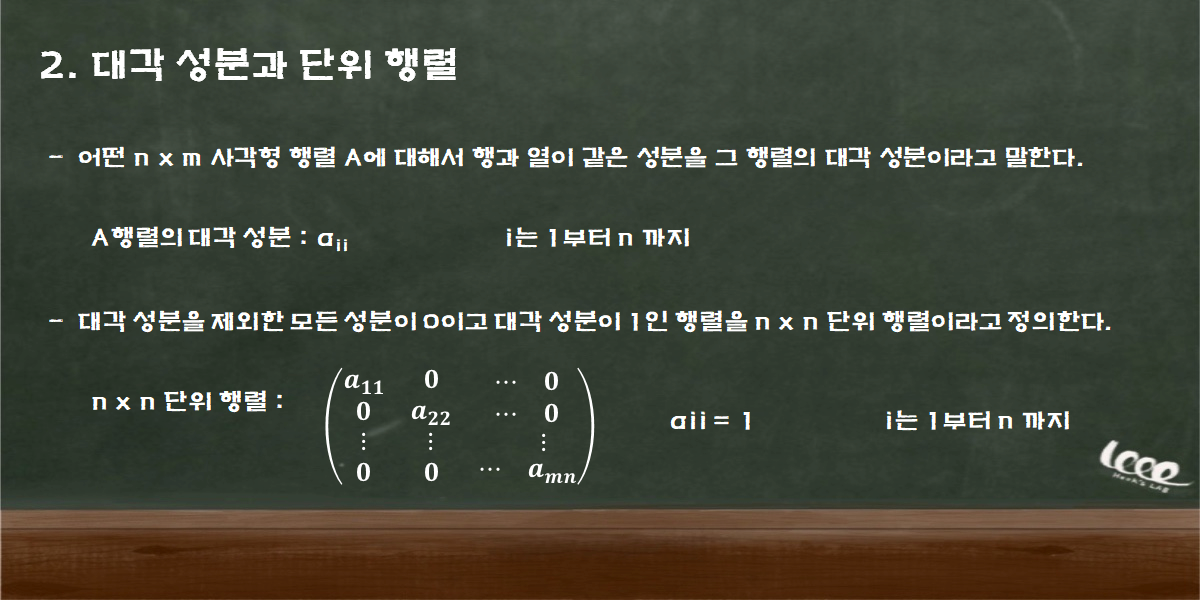 행과 열이 동일한 성분을 그 행렬의 대각 성분(Digonal Component)라고 부른다. 그리고 그 행렬이 n차 정사각형 행렬이라면, 대각 성분이 aij이고 나머지 성분이 0인 행렬을 정의할 수 있다. 이 행렬을 대각 행렬(Digonal Matrix)이라고 부른다. 만약, 대각 행렬의 모든 원소가 1이라면, 그 행렬을 n x n 단위행렬(unit matrix)이라고 말한다.