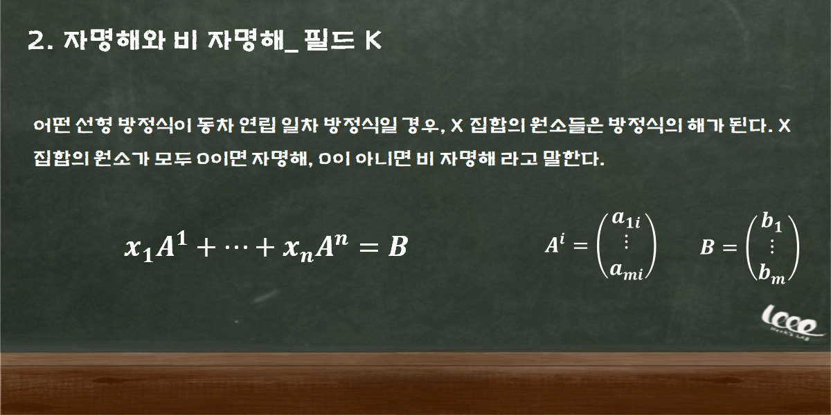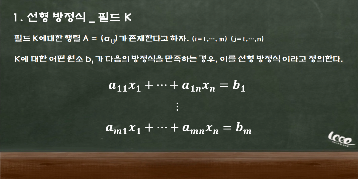 어떤 K 필드가 존재한다고 가정하자. 다음의 조건을 만족하는 i와 j에 대해 만들어진 선형 조합식을 선형 방정식(Linear Equation)이라고 부른다.