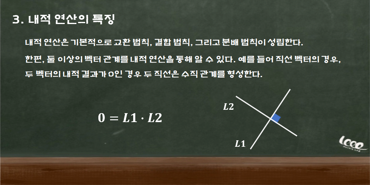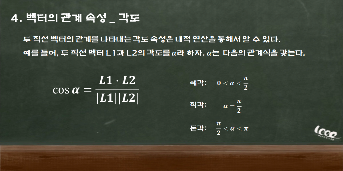 내적 연산과 벡터의 크기 속성을 이용하면, 직선 벡터의 관계를 각도라는 개념으로 명확히 서술할 수 있다.