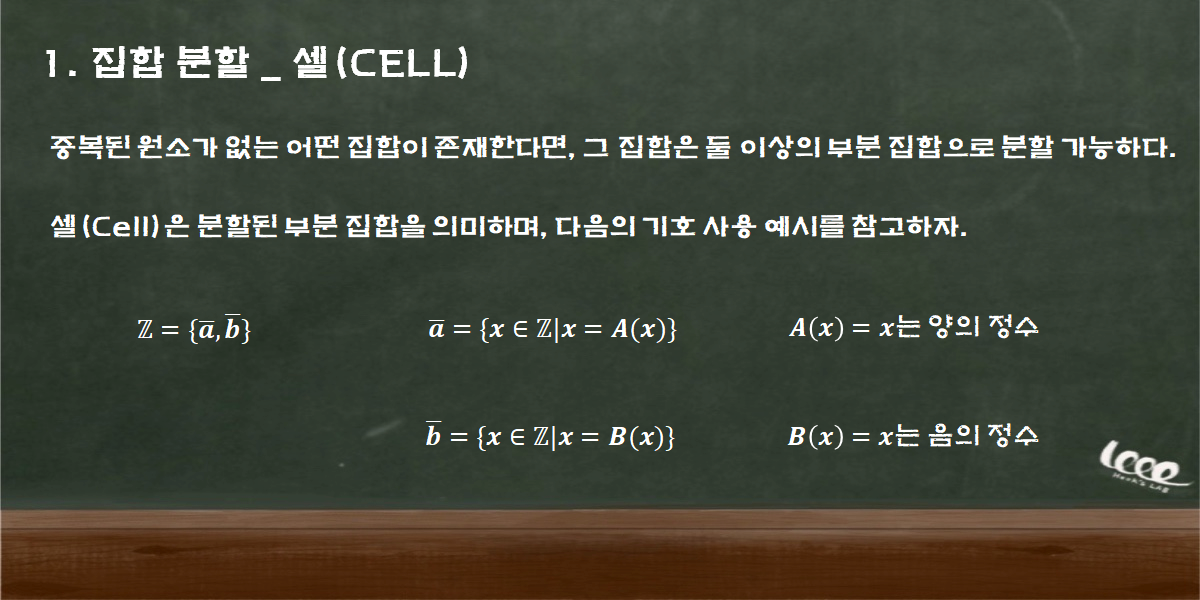 어떤 집합의 원소들 중 어느 하나라도 중복된 원소가 없다면, 그 집합은 둘 이상의 집합으로 분할(Partition) 가능하다. 이렇게 생성된 집합의 하위 집합을 셀(Cell)이라고 부른다. 일반적으로 셀의 기호는 대수학에서 다음과 같은 기호를 사용하므로 참고해두도록 하자.