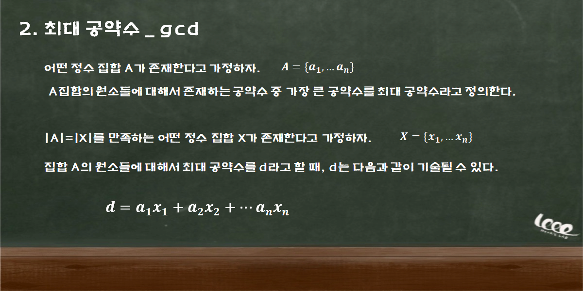 어떤 정수를 약수(divisor)로 나누었을 때 그 비는 정수비가 된다. 그리고 둘 이상의 정수에 대해서 어떤 정수가 둘 모두에게 약수가 된다면, 그 정수를 공약수(common divisor)라고 정의한다. 그렇다면, 최대 공약수는 어떤 개념일까? 다음을 참고하자.