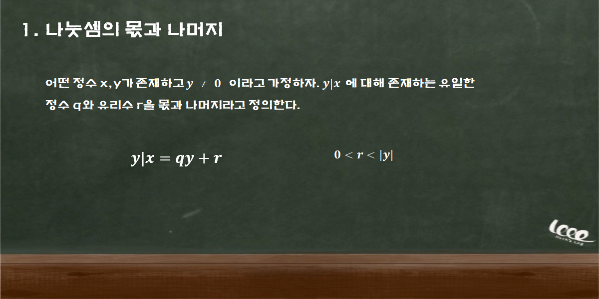 정수 집합에서 두 정수의 비는 항상 일정하게 나누어 떨어지는 것은 아니다. 따라서 나눗셈의 결과에는 항상 몫과 나머지가 생기기 마련인데, 다음의 정리를 참고하자.