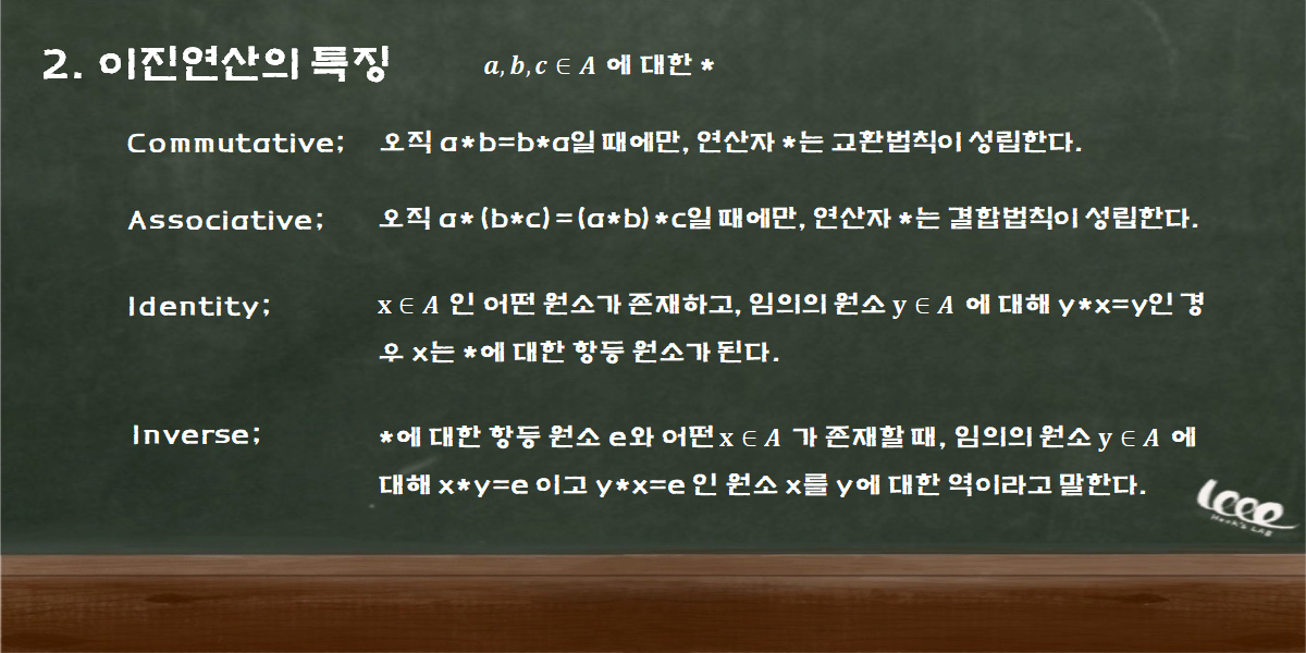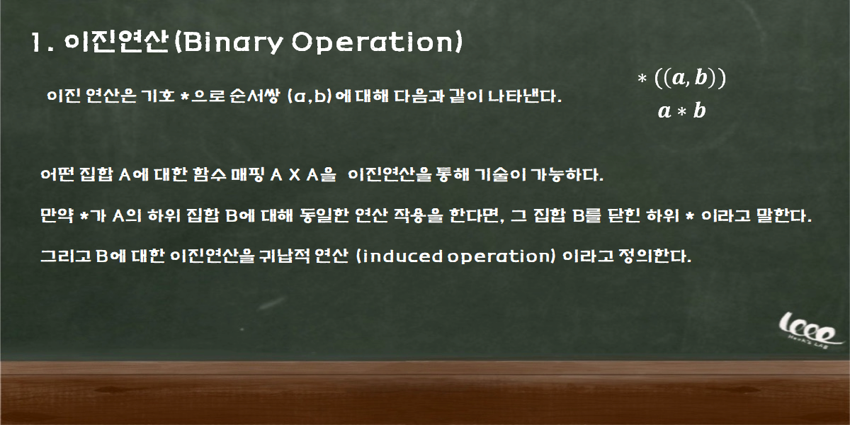 이진 연산자는 추상 대수학의 가장 핵심적인 개념으로 두 집합의 이항관계를 추상적으로 제시한다. 이 개념은 이후의 군론의 초석이 되는 개념이므로 반드시 짚고 넘어가자.