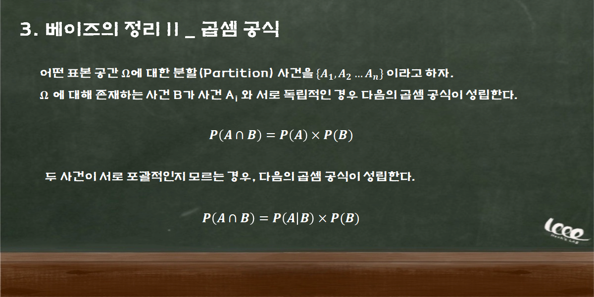 만약 표본 공간에 대한 어떤 두 사건이 서로 포괄적인지 아닌지 모른다면 어떨까? 그렇다면 전체 확률의 법칙에 따라 식을 전개하면 된다. 이것이 베이즈의 공식(The Bayes' formula) 혹은 규칙이다. 베이즈 공식을 이해하기에 앞서 다음의 곱셈 공식을 먼저 이해해보자.