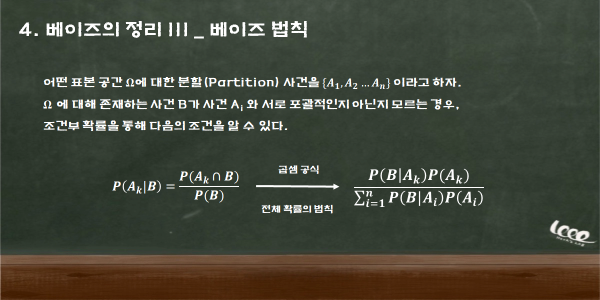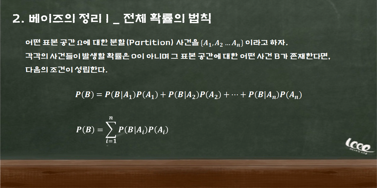 결론적으로 베이즈의 공식은 전체 확률의 법칙에 따라 전개한 둘 이상의 사건들에 대한 확률 관계이다.