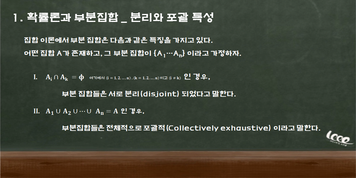 부분집합의 특징 중에서 분리와 포괄적 특성은 확률의 사건 집합에 대응될 수 있는 개념이다.
