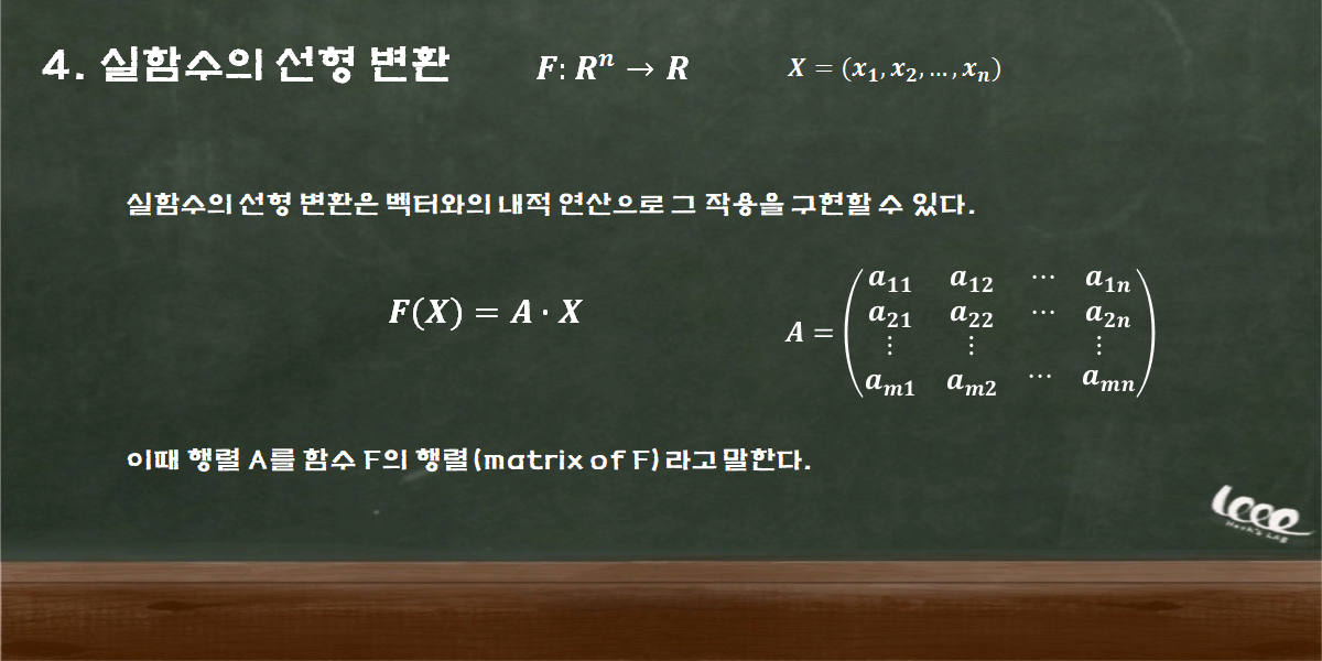 모든 실함수의 선형 변환 함수는 벡터와의 내적으로 나타낼 수 있다. 다음의 선형 변환 함수의 행렬에 관한 정리를 참고 하자.