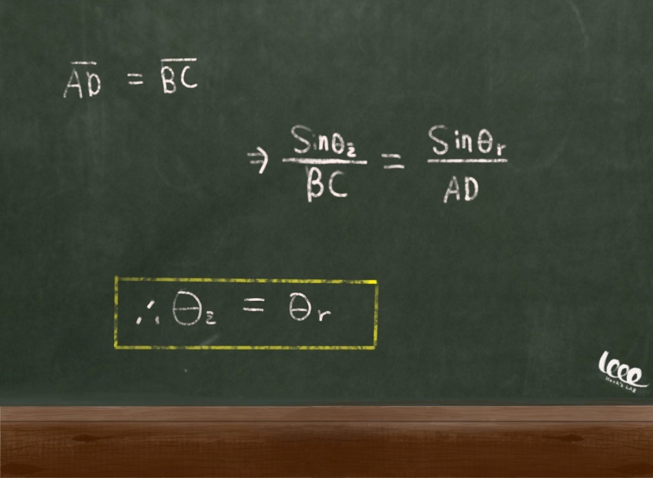 빛이 부분적으로 위와 같이 반사되면, 그 입사하는 파면과 동일한 거리를 이동한 반사 파면과의 경계면을 공유하는 두 삼각형의 합동 공식을 따른다. 따라서 다음과 같은 관계식을 얻는다.