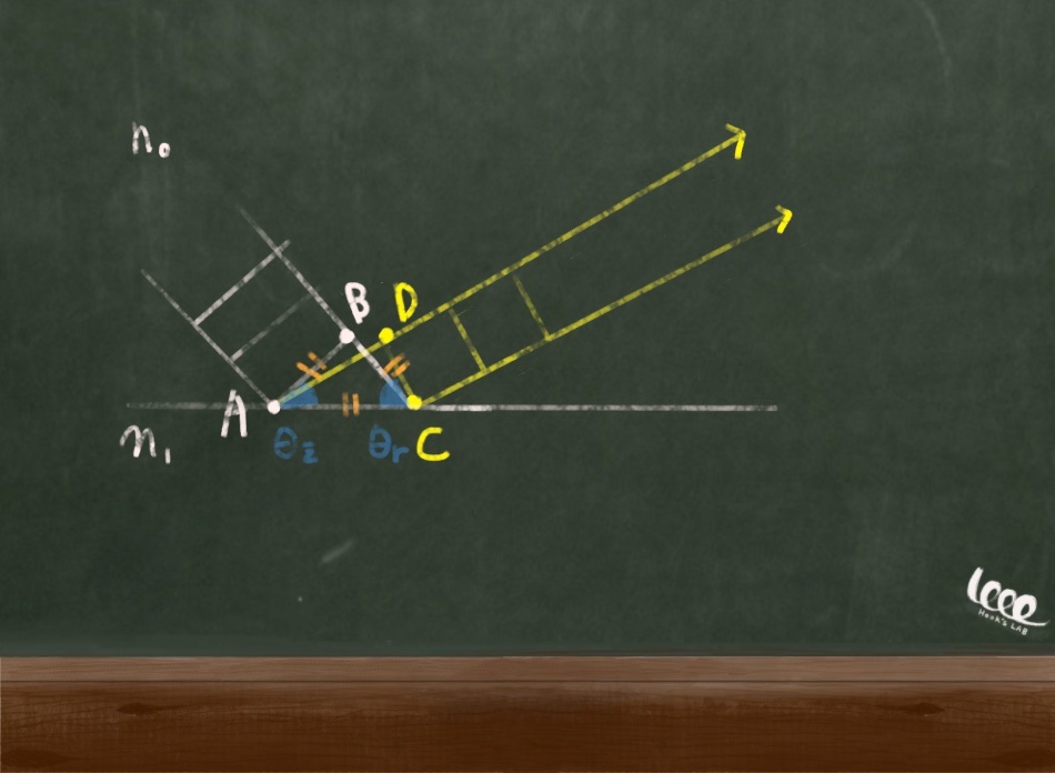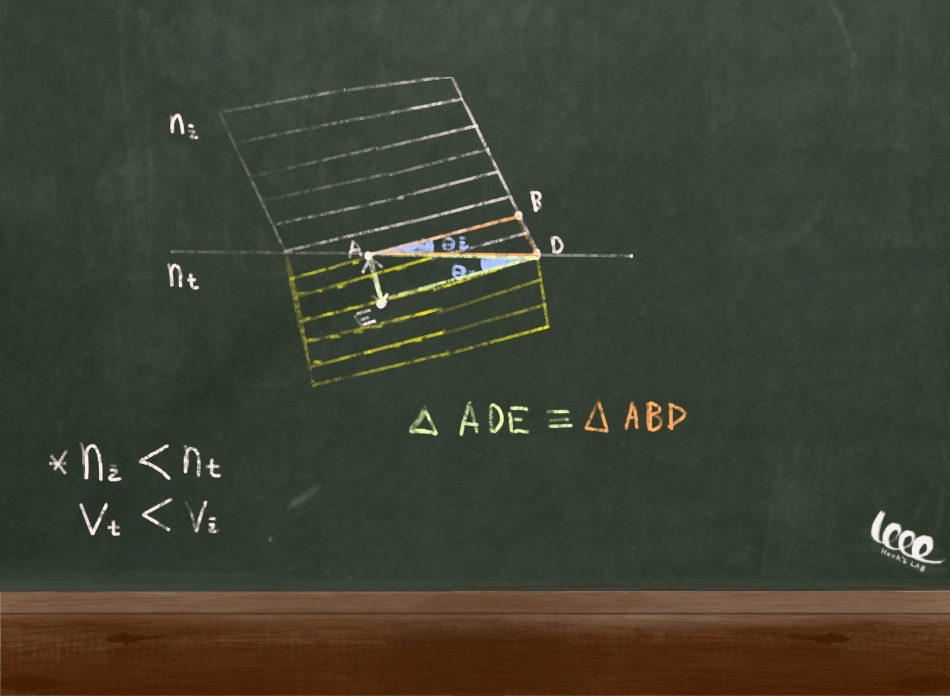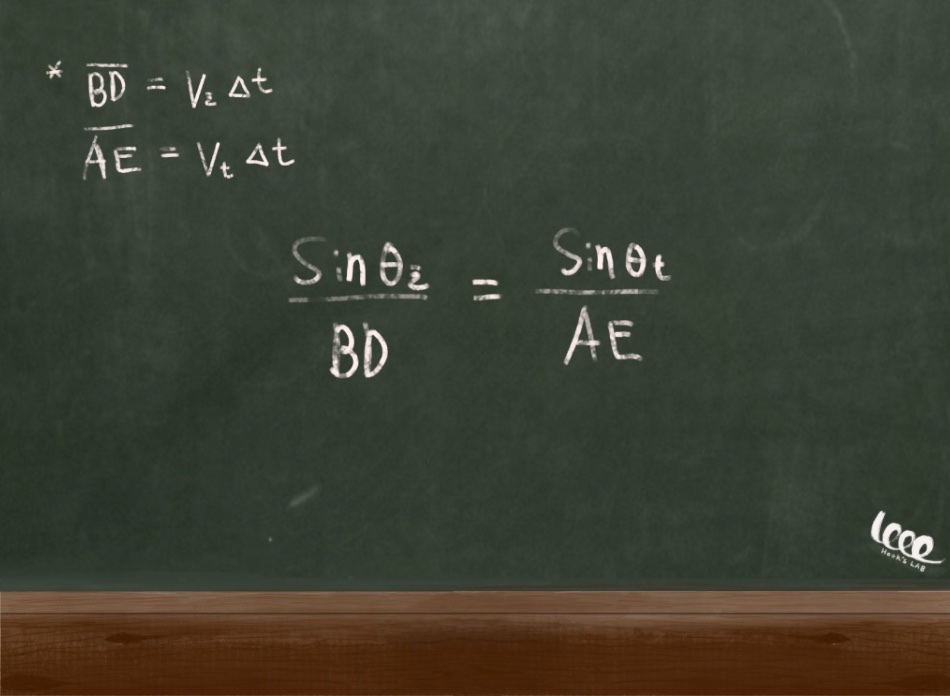 B. 이때 같은 위상의 파면을 부분적으로 관찰하면, 삼각형 ADE는 매질을 통과한 빛의 일부분이고, 삼각형 ABD는 아직 통과하지 못한 빛의 부분이다. 기하학적으로 삼각형의 합동 공식에 따라서 다음의 관계식이 성립한다.