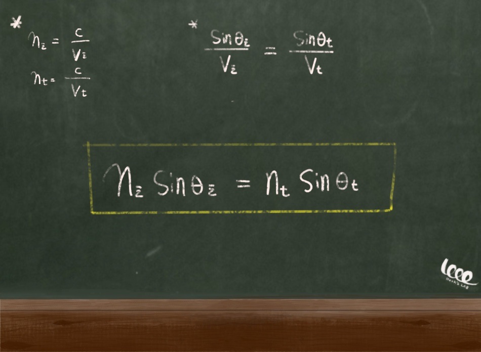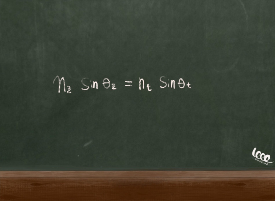 굴절의 법칙이라고도 불리는 이 스넬의 법칙은 매질이 다른 곳을 지나는 광선은 굴절이 발생하게 되는데, 이때 입사각과 반사각은 다음과 같은 관계식을 가지고 있다.