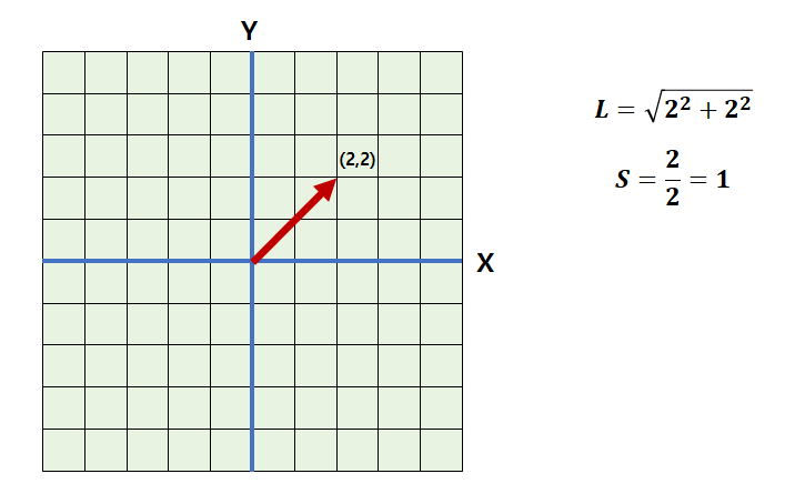 벡터의 길이를 L이라고 할 때, 주어진 벡터의 길이 제곱, L2 = 22+22이다. 그리고 그 기울기는 2/2로 1이 된다. 선형 대수학에서는 벡터의 길이와 기울기 속성을 크기(Magnitude)와 기준(Norm)으로 대신한다. 크기와 기준에 대한 정의는 다음의 정리를 참고하자.