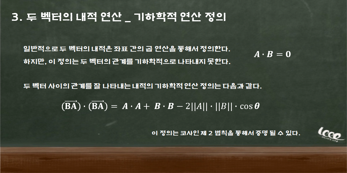 이번에는 두 벡터의 내적 연산을 수행해보자. 두 벡터 A, B의 내적 결과는 0이다. 이것이 무엇을 의미하는가? 두 벡터의 내적 연산은 두 벡터 사이의 각도를 알려준다. 다음의 기하학적 정의를 통해서 내적 연산이 갖는 의미를 이해하자.
