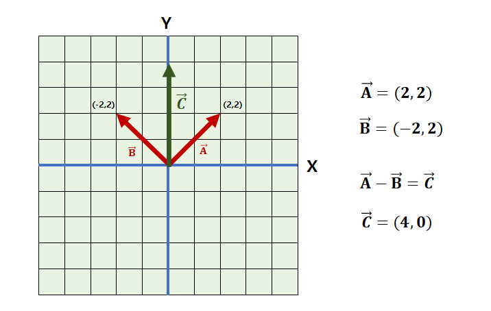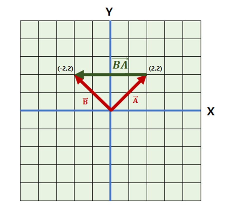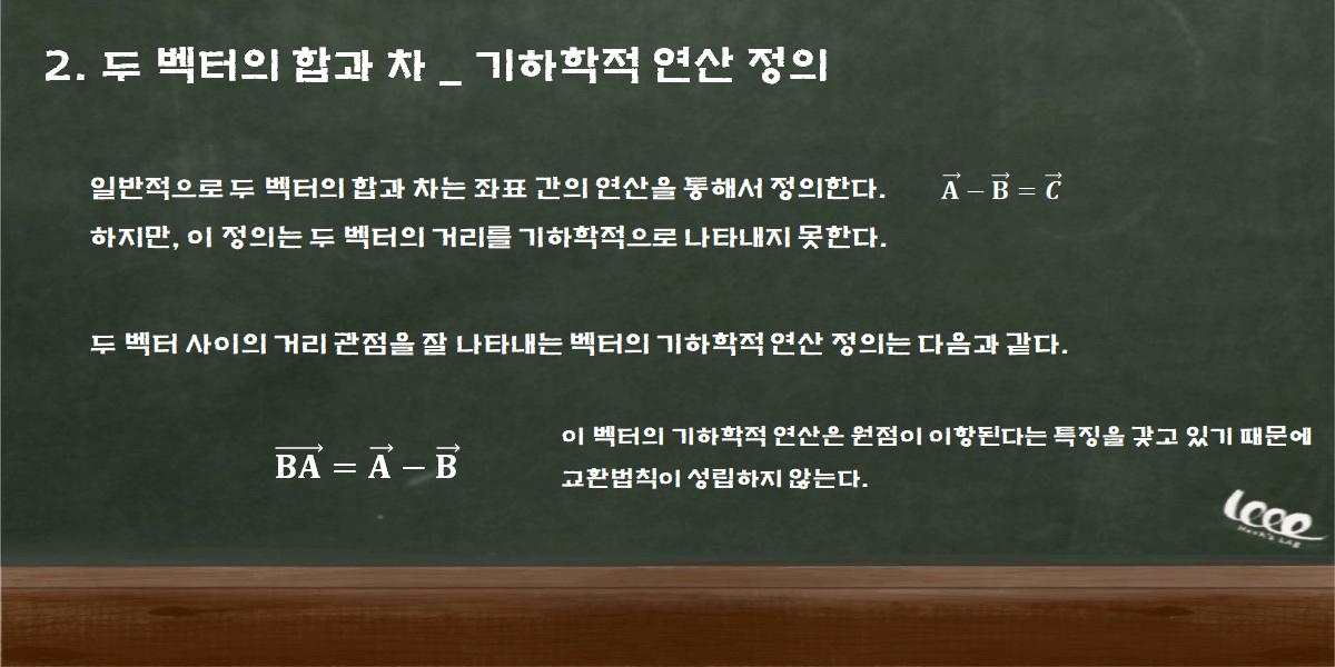 두 벡터의 연산은 새로운 C 벡터를 형성했고, 그 크기는 4이다. 이처럼 두 벡터의 차를 통해 형성된 벡터의 크기가 바로 두 벡터 사이의 떨어진 거리가 된다. 위의 그림에서 새로 형성된 벡터의 크기 속성만을 따져보면, 정확히 A와 B 사이의 거리가 된다. 이 C 벡터는 두 벡터 사이의 거리를 기하학적으로 보여주지 않기 때문에 거리 관점에서 두 벡터의 차이를 새롭게 정의한 개념이 존재한다. 다음의 기하학적 정의를 참고하자.