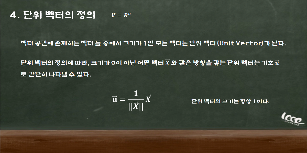 벡터의 좌표는 방향을 알려주지만, 크기 속성 때문에 두 벡터의 관계를 복잡하게 만든다. 이에 크기가 1이지만, 그 벡터의 방향을 알려주는 단위 벡터 개념이 등장했다. 단위 벡터의 정의는 다음을 참고하도록 하자.