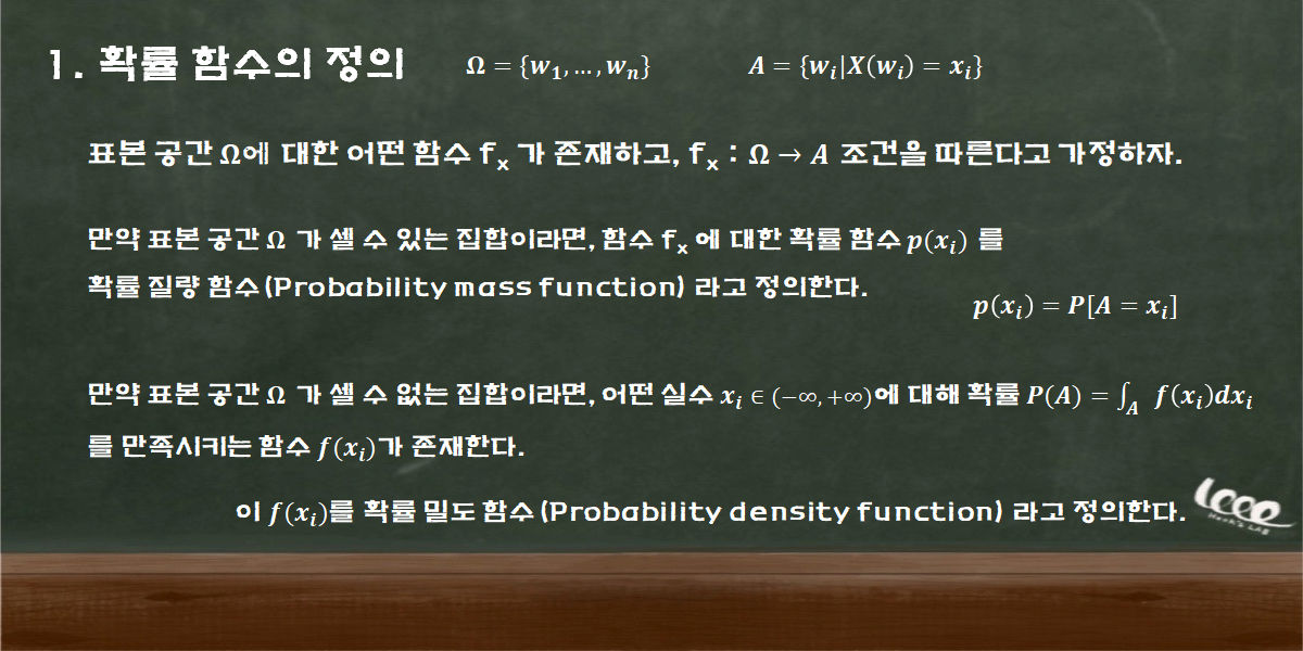 랜덤 변수의 두 가지 성질에 따라, 확률 이론의 함수도 두 가지로 나누어진다. 먼저, 이산적 랜덤 변수는 확률 질량 함수(Probability mass function)가 된다. 그리고 연속적 랜덤 변수에 대한 함수는 확률 밀도 함수(Probability density function)가 되는 것이다. 두 확률 함수의 정의는 다음과 같다.