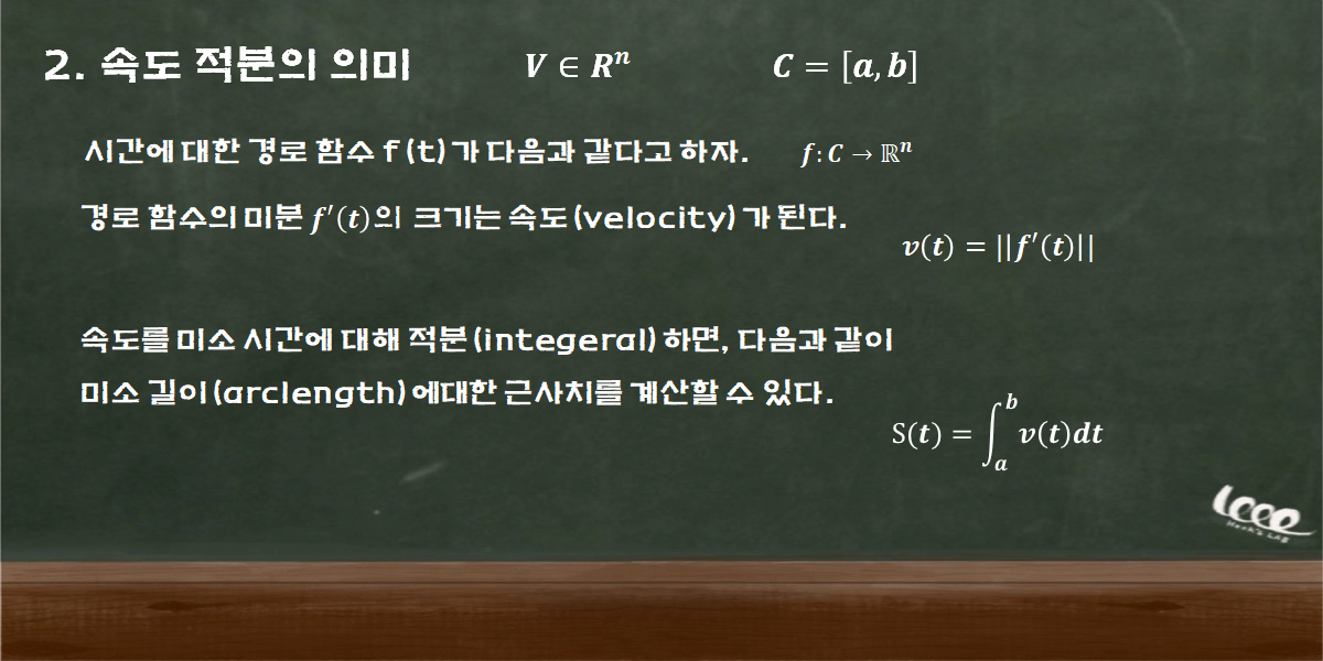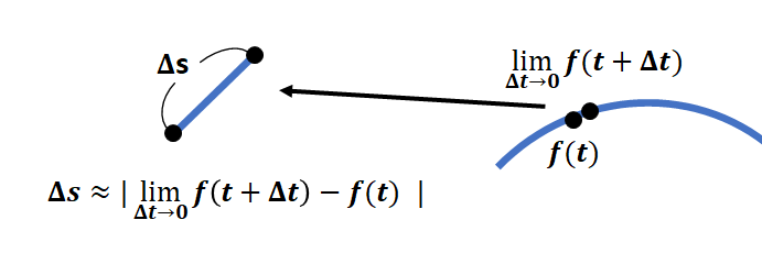 극한적 정의에 따라 곡선의 경로를 직선으로 근사 시킬 수 있다. 그렇다면, 극한적 관점에서 곡선의 미소 길이를 미소 시간으로 나눈 것이 바로 속도일 것이다. 경로 함수에 대한 미분이 속도 개념과 일치하기 때문에 우리는 곡선의 미소 길이를 다음과 같은 적분 형태로 정의할 수 있다.