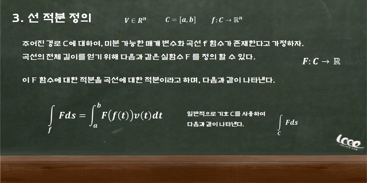 이 새로운 함수 F를 주어진 범위 내에서 적분한다면, 곡선의 전체 경로를 얻게 될 것이다. 이를 선적분이라고 한다.