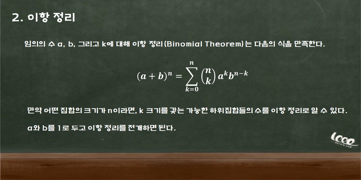 이항 정리(binomial theorem)는 수학적 정리로 정의는 다음과 같다.