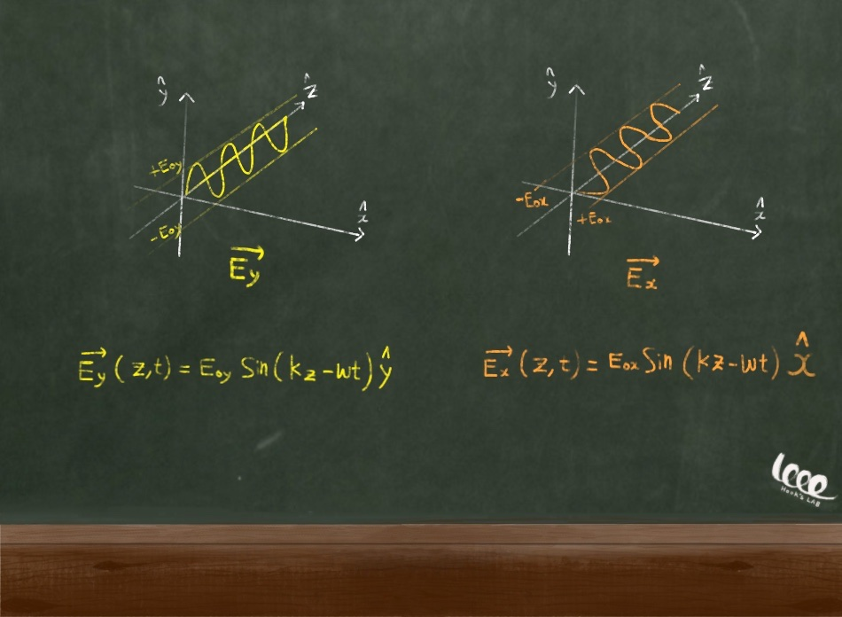 다음과 같이 두 전자기 파동이 각각 x축과 y축으로만 진동한다고 가정한다.