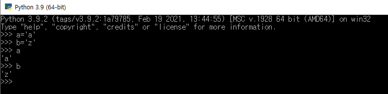 특정 변수에 데이터를 a='a', b='z'와 같은 명령어를 통해서 string의 데이터를 저장하는 것이 가능하다.